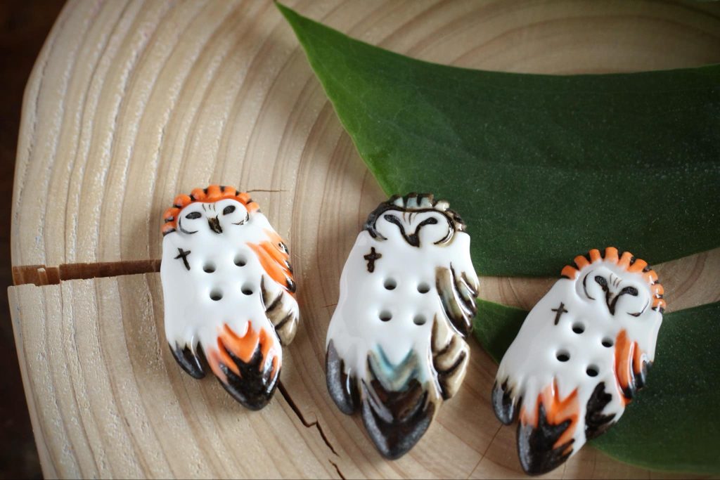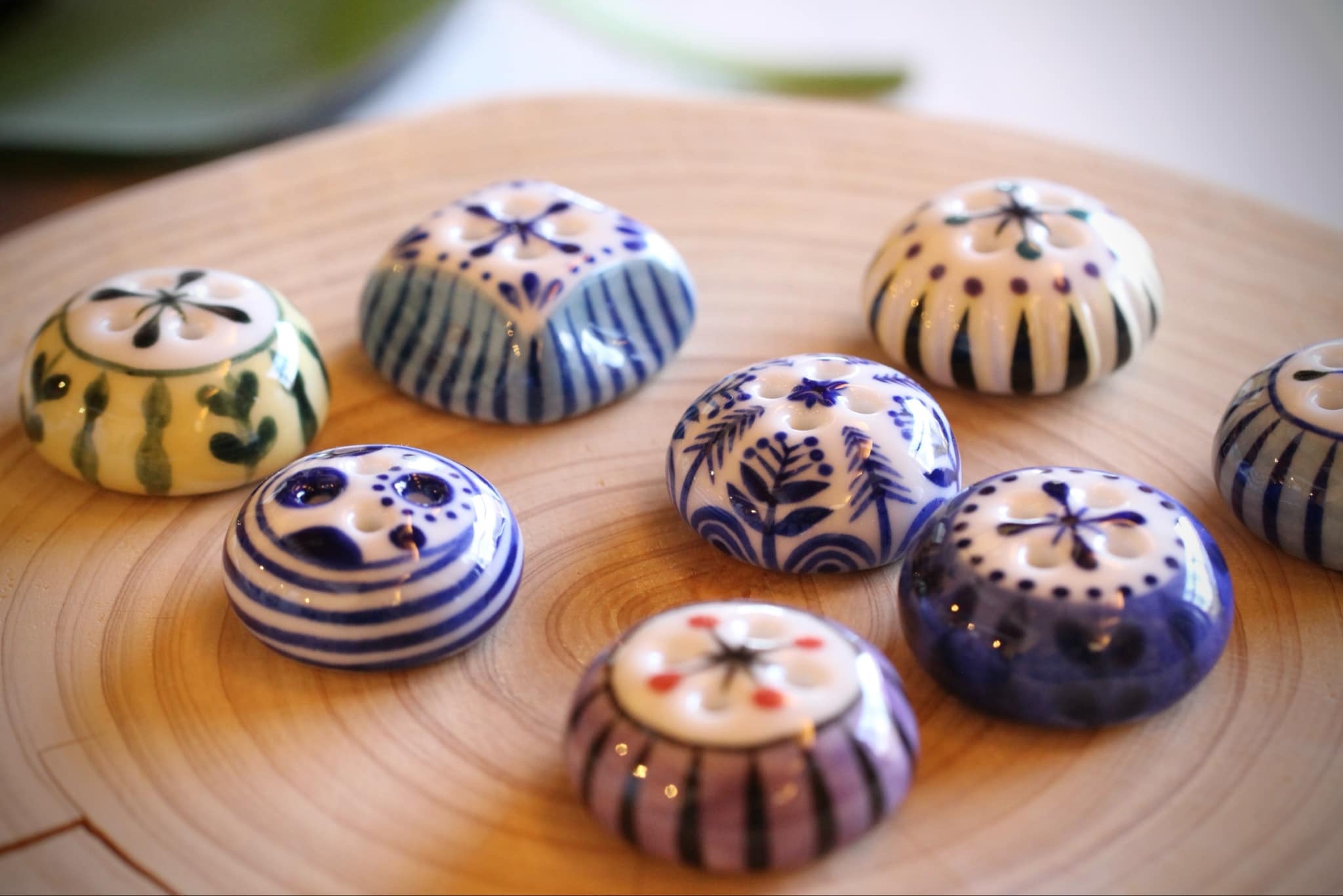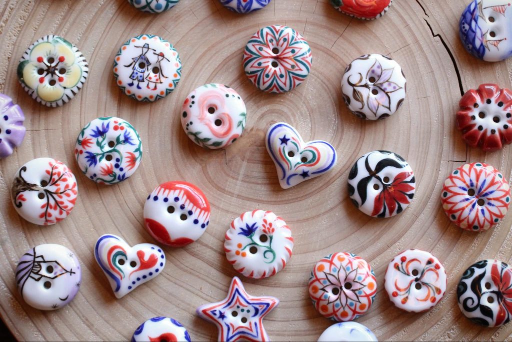 天草ボタンとは、作家の井上ゆみさんが作る天草陶石を原料にした磁器のボタンのこと。